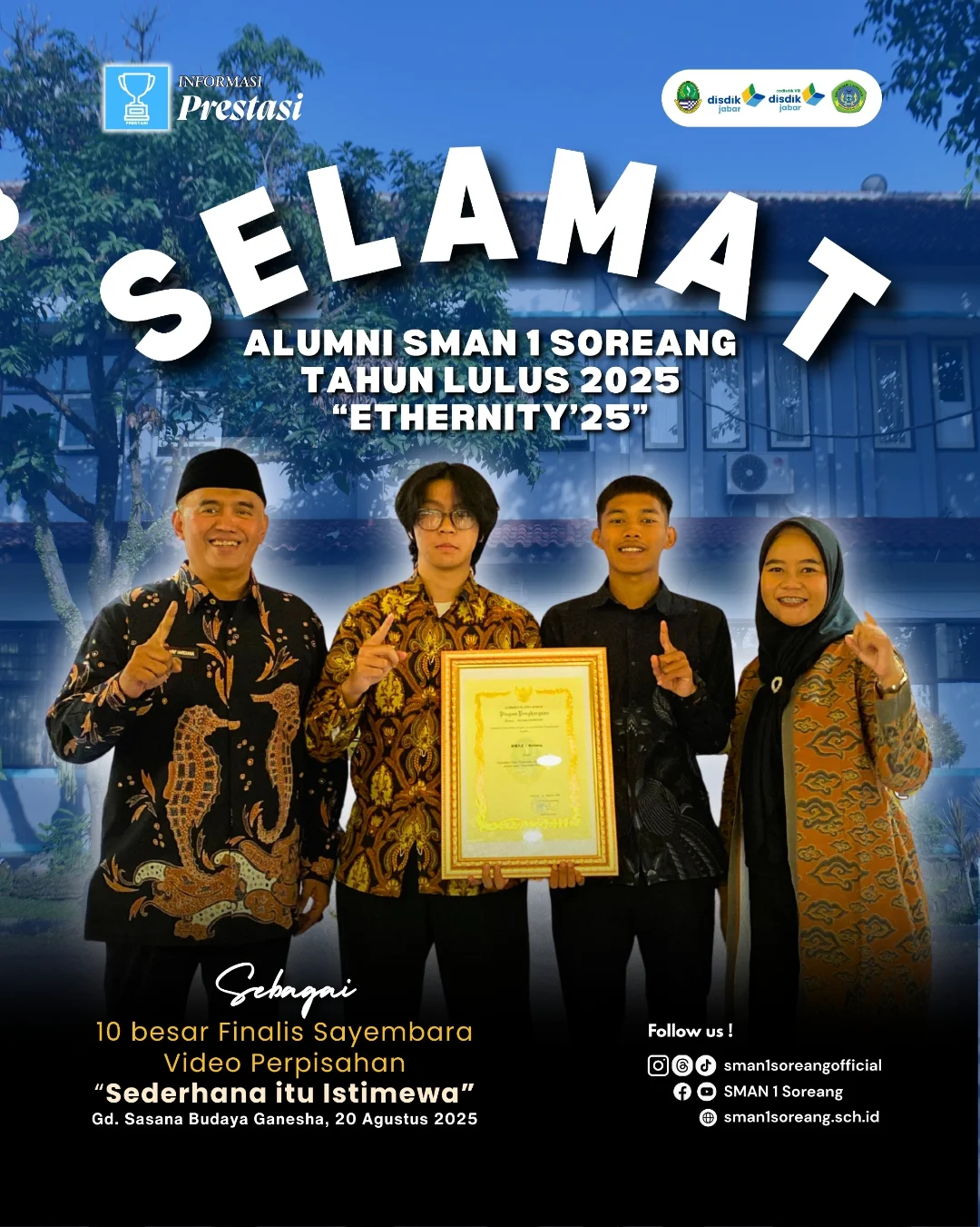 Selamat kepada Alumni SMAN 1 Soreang tahun lulus 2025 @ethernity.25@smanso.25 sebagai 10 Besar Finalis Sayembara Video Perpisahan bertajuk, “Sederhana itu Istimewa” dari 406 sekolah. Sayembara yang diselenggarakan oleh Gubernur Provinsi Jawa Barat, Bapak Dedi Mulyadi, S.H; Dinas Pendidikan Provinsi Jawa Barat; dan Bank BJB Jabar Banten ini menyelenggarakan penyerahan pemghargaan di Gedung Sasana Budaya Ganesha, pada hari Rabu, 20 Agustus 2025.
