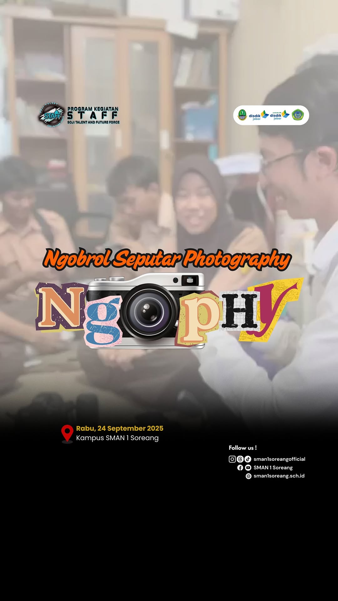 dilaksanakan pada hari rabu, 24 September 2025 di Ruang IT SMAN 1 Soreang diikuti oleh Siswa dan Siswi SMAN 1 Soreang dengan Narasumber Bapak Saiman Nugraha, S.Pd dari @timitsoji dengan pembahasan mengenal komponen dan fitur kamera secara umum.