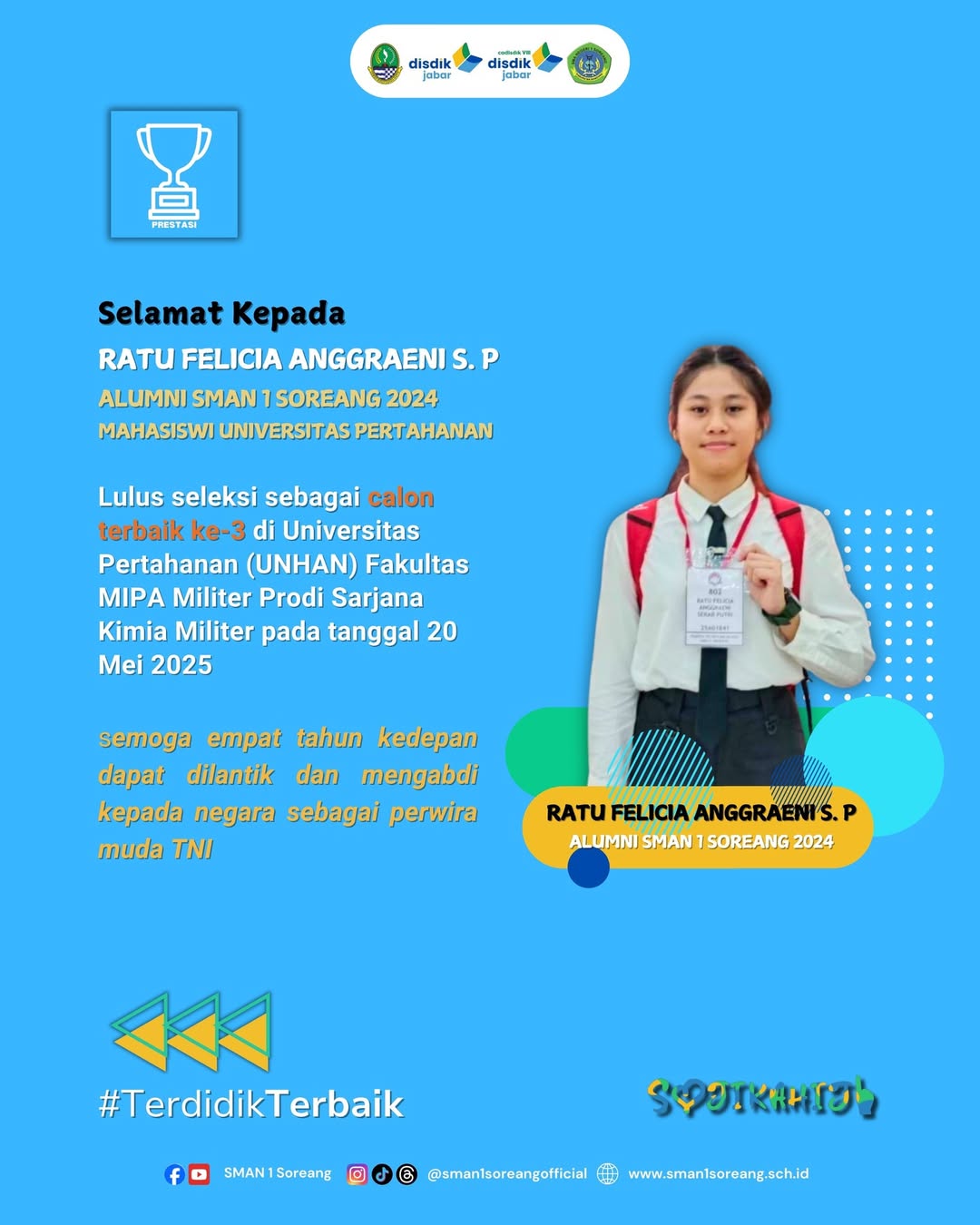 Lulus seleksi sebagai calon terbaik ke-3 di Universitas Pertahanan (UNHAN) Fakultas MIPA Militer Prodi Sarjana Kimia Militer pada tanggal 20 Mei 2025