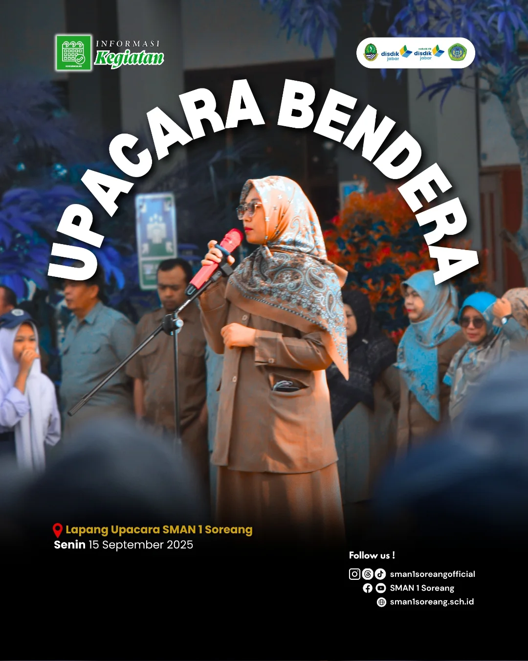 Telah dilaksanakan Upacara Bendera di Lapangan Upacara SMAN 1 Soreang. Pembina upacara hari ini adalah Ibu Nazmi Irdariandini Putri dan petugas pada upacara kali ini adalah Kelas 11.5 dibantu oleh tim Paduan Suara dan Marching Band SMAN 1 Soreang.